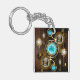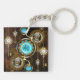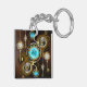 Turquoise lenses with antique watch with brass gears and golden keys on rusty, brown background. Steampunk style.