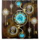 Turquoise lenses with an antique watch with brass gears and golden keys on rusty, brown background. Steampunk style.