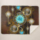 Turquoise lenses with an antique watch with brass gears and golden keys on rusty, brown background. Steampunk style.