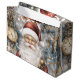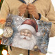A large gift bag for your favourite gifts to place under your tree with a portrait of Santa Claus in his wire rimmed glasses and burgundy Santa hat surrounded by his workshop clocks. Santa also has a touch of Christmas blue and grey hues and his clocks are done in a delicate ivory and beige. He has a bit of a whimsical and steampunk twist. Santa also appears on matching tissue paper and gift tags. Designed by mw1designsart.
