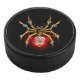 Mechanical, steampunk spider with gold, brass gears and a red glass lamp on a black background. Steampunk style.