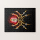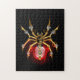 Mechanical, steampunk spider with gold, brass gears and a red glass lamp on a black background. Steampunk style.