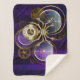 Steampunk spider made of gold and steel with antique watches decorated with gold gears on purple, striped, textured background with lenses and brass gears. Steampunk style.