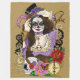 Steampunk day of the dead woman wearing sugar skull make-up. Dressed mostly in purple. Around her are gears, skull, clock, roses and keys.