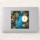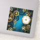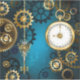 Turquoise, textured, steampunk background with brass and gold gears, a silver key and the clock. Steampunk style.