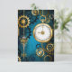 Turquoise, textured, steampunk background with brass and gold gears, a silver key and the clock. Steampunk style.