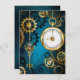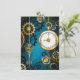 Turquoise, textured, steampunk background with brass and gold gears, a silver key and the clock. Steampunk style.