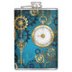 Turquoise, textured, steampunk background with brass and gold gears, a silver key and the clock. Steampunk style.
