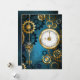 Turquoise, textured, steampunk background with brass and gold gears, a silver key and the clock. Steampunk style.