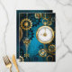 Turquoise, textured, steampunk background with brass and gold gears, a silver key and the clock. Steampunk style.