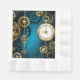 Turquoise, textured, steampunk background with brass and gold gears, a silver key and the clock. Steampunk style.