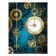 Turquoise, textured, steampunk background with brass and gold gears, a silver key and the clock. Steampunk style.