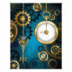 Turquoise, textured, steampunk background with brass and gold gears, a silver key and the clock. Steampunk style.