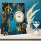 Turquoise, textured, steampunk background with brass and gold gears, a silver key and the clock. Steampunk style.