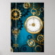 Turquoise, textured, steampunk background with brass and gold gears, a silver key and the clock. Steampunk style.