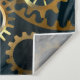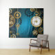 Turquoise, textured, steampunk background with brass and gold gears, a silver key and the clock. Steampunk style.