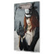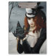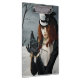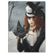 Steampunk red haired woman out on a winter walk, releasing her dragonfly messenger with a key.