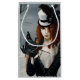 Steampunk red haired woman out on a winter walk releasing her dragonfly messenger with a key.
