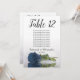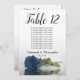 These beautiful table number cards will make it easy for your guests to find their seats at your wedding reception. They feature a simple yet elegant design with script calligraphy lettering and a single long-stemmed dusty steel blue coloured rose lying on its side reflecting in water. The card includes a seating chart with 10 names. There is also space for the couple's names and wedding date. This card is available in a variety of sizes and is larger than our standard table number cards.