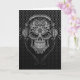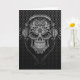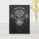 An elaborate DJ sugar skull design decorated with intricate swirls and dot patterns. Headphones sit on top of the skull with two wires hanging below. The complex lines and circles are solid black while the interior of the skull is finished with stainless steel textures and silver colours. The skull sits on top of a steel mesh background which completes this industrial pattern. This aggressive Day of the Dead inspired image is a colourful representation of DJ culture.