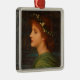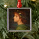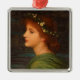 This design features a painting by the English Victorian artist Frank Dicksee (1853–1928). It is a portrait of a beautiful woman with red hair. She has a wreath of white roses around her head. She has blue eyes and rosy red lips. She is wearing a green dress. There are dark clouds in the evening sky behind the lady. The original artwork was painted by Frank Dicksee in 1900.