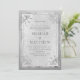 A slab of toasted silver rock is the backdrop for this dramatic all silver shimmering metallic invitation with sparkling silver frame, hand drawn silver pencil border with classic and formal typography.