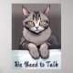 Poster in an illustration of a stern-looking grey tabby cat with piercing yellow eyes resting its front paws on a ledge, gazing directly forward with an air of serious authority. Below the cat, bold script reads, “We Need to Talk,” adding humour and drama.