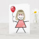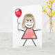 Stick girl with red balloon, gingham dress, hair, and red glasses on white background for birthday