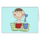 A cute stick figure boy sits on a beach towel at the beach on T-shirts, mugs, cards, stickers, magnets, buttons, and other stick figure beach theme apparel and gifts.