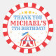 Venez un, venez tous ! Merci à tous d'être venus à la plus grande fête d'anniversaire sous le grand chapiteau avec nos modèles étiquettes ronds du carnaval de cirque. Ce étiquette de fête de carnaval de cirque présente une tente de cirque rouge arrière - plan avec tente rouge et bleue sur un design étiquette rond.