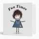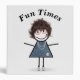 Cute stick figure girl with hair, blue denim dress, pearl necklace, red glasses, and sneakers on soft white textured background.
