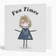 Cute stick figure girl with blonde hair, blue denim dress, pearl necklace, red glasses, and sneakers on soft white textured background.