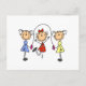 Three little stick figure girls having a blast jumping rope on stick figure T-shirts, mugs, tote bags, cards, stickers, and other items that are customizable and make great gifts for family members, children, friends, and coworkers!