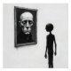 A stick figure man stands in front of a portrait, gazing at a sad-looking bald man in an art gallery
