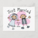 Cute happy stick figure couple with pink hearts in the background. The bride is wearing a wedding dress and the groom is wearing a tuxedo with bow tie. Text says JUST MARRIED. Customize it with your wedding date or whatever you like. Perfect for your honeymoon. PinkInkArt original!