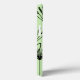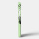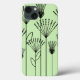 This phone case has a mid-century modern design of plants made from lines, circles, triangles, rectangles, and squares in black on a green background.