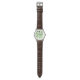 This men's watch has a mid-century modern design of plants made from lines, circles, triangles, rectangles, and squares in black on a green background.