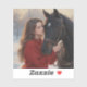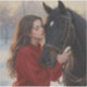 A serene winter scene captures a tender moment between a young woman and her loyal horse. Clad in a warm red coat, she gently rests her forehead against the horse’s, their breath mingling in the crisp, snow-filled air. The golden hues of the background contrast with the falling snowflakes, evoking a sense of peace, trust, and quiet companionship in nature’s embrace.