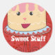 Couleur Rétro Mignonne Rouge rouillé. Boulangerie bleu pâle et rose Cupcakes et Cookies Stickers. Cute Deep Rusty Red, Rose, Tan and Blue Cute Produits cuits avec les yeux adorables et bouches baisables avec vos informations commerciales ou de partir comme c'est avec "Sweet Stuff" écrit en blanc blanc..