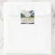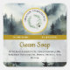 Cet autocollant magnifiquement conçu présente une toile de fond d'une forêt brumeuse d'arbres conifères avec des éléments de conception d'un rond avec du texte, et une bande de superposition or et blanc avec du texte.