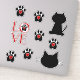 Cette feuille d'autocollants comporte un chat noir, une tête de chat avec des whiskers, six empreintes de pattes noirs avec un coeur rouge au centre, et le mot amour avec un empreinte de patte.