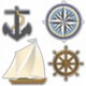icônes nautiques; ancre, rose de boussole, bateau et barre de navire.