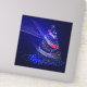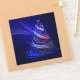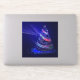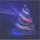 Arbre de Noël SlipperyJoe numérique rubans rouges verts bleus translucides brillant d'énergie festive cercles de lumières bleues concentriques vers l'extérieur présence éthérée presque holographique lumières et étincelles radieuses fond bleu profond cadeaux de fierté gay atmosphère magique émet des faisceaux des traînées de lumière mouvement et flux LGBTQIA
