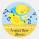 Sticker personnalisé pour un bébé garçon ou une petite fille douche. Cute canard sur un arrière - plan bleu et jaune avec le nom de maman à être. Utilisez des autocollants pour rendre des baby showers colorés faveurs. Placez-les sur des cartouches, des boîtes, des bouteilles et des bougies votives pour rendre les faveurs du baby shower cool. Le peut être utilisé sur les enveloppes d'invitation et sur les paquets cadeaux pour les épicer.