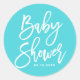 Autocollant sur baby shower personnalisable avec un script bleu aqua à lettres. Personnalisez en ajoutant la date de l'événement ou le nom du célébrant. Parfait pour les invitations et les faveurs événementielles. D'autres couleurs et objets correspondants sont disponibles.