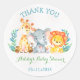 Cet autocollant de baby shower à thème pour animaux safari présente un joli éléphant, une girafe et un lion sur un arrière - plan de papier aquarelle scanné. Le design présente également un peu de feuillage décoratif. Même carte de remerciements design et invitation est également disponible au magasin. Cet autocollant de baby shower de safari animal est prêt à être personnalisé.