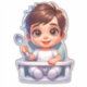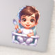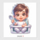 Joli dessin d'un bébé garçon aux cheveux bruns aux yeux marron assis sur une chaise tenant une cuillère. Autocollant adorable.