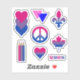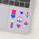 Autocollants vinyle taillés sur mesure avec une variété de motifs aux couleurs du drapeau de la fierté de la bisexualité; les formes incluses : un signe de paix, le coeur, les étoiles, une feuille d'érable, une fleur de lis, des crayons, et le texte orgueil