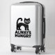 Chat noir stylisé avec de grands yeux et une expression ludique. Le corps du chat est conçu dans une forme simple et moderne, en mettant l’accent sur sa queue courbée et sa forme ronde. Sous le chat, l'expression "TOUJOURS FAIM" est affichée en caractères gras, également en noir. L'ensemble est minimaliste, avec des couleurs monochromes qui ajoutent à l'attrait des lieux. La combinaison du chat et du texte crée un thème plein d'humour et de charme, qui séduit probablement les amoureux de les chats.