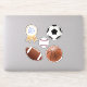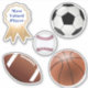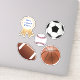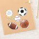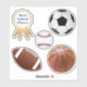 Feuille d'autocollants à thème sportif avec des graphiques d'une balle de football, de baseball, de football, de basket et d'un ruban d'or. Personnalisez le texte bleu en gras, sur le ruban, pour lire ce que vous voulez.